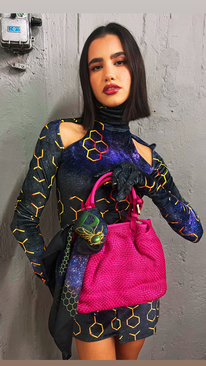 Velvet Mini dress with shoulder cut-outs and a futuristic honeycomb print. Features long sleeves with integrated gloves and concealed inner zippers that allow the hands to be released when desired.